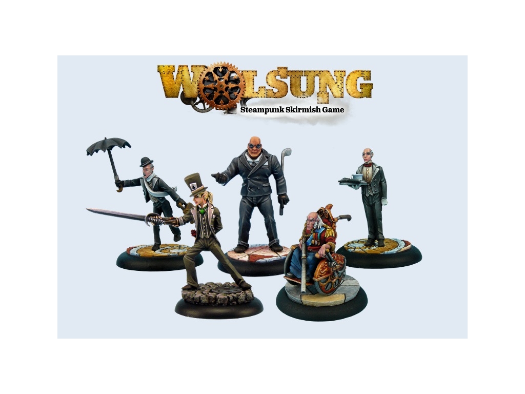 The set consist of 5 28mm, not painted miniature cast in white metal. All minis provided with a 30mm regular plastic wround base. Sir Lance Oakroot (1) Sir Zachary Fiercebatten (1) Ogre Bruiser (1) Butler with Plate (1) Butler with Umbrella (1) Download free rules for Wolsung SSG on http://www.wolsung-ssg.com/
