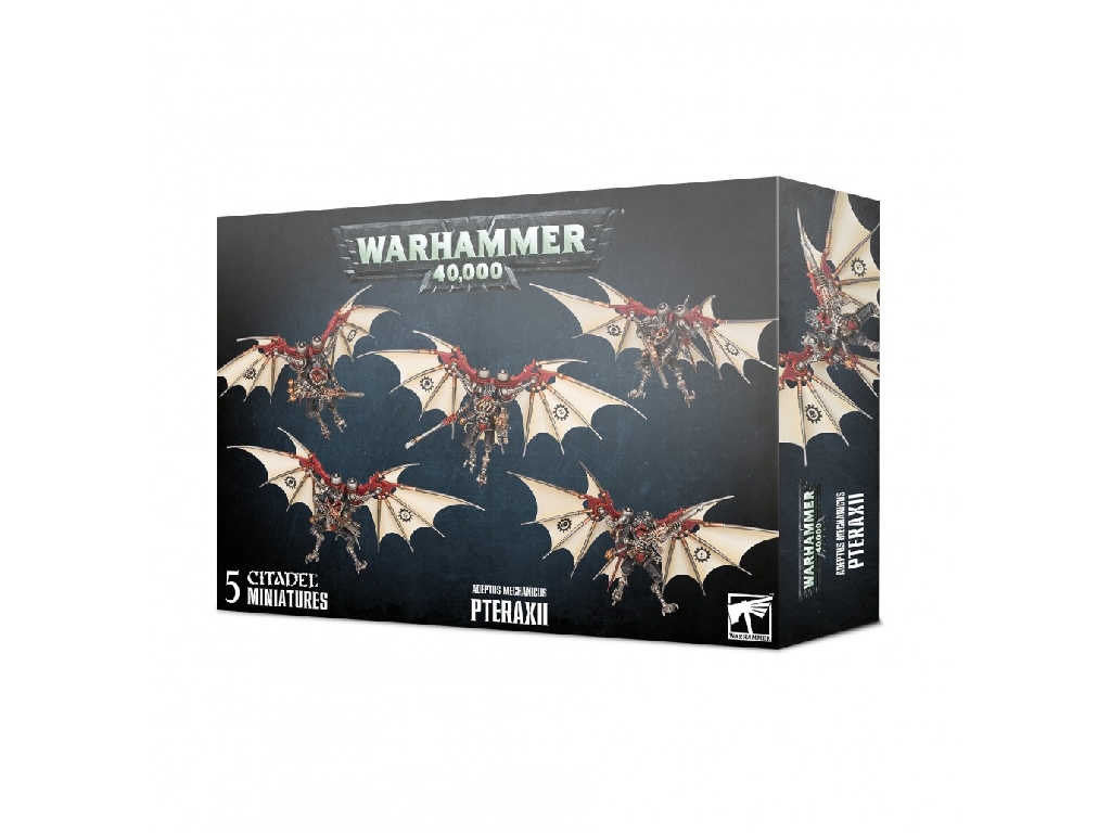 One of many specialised castes of cyborg warriors available to the Adeptus Mechanicus, the Pteraxii are optimised for instinctive reaction and agility. Pteraxii’s reflexes are accentuated by paring back elements of cogitation that impede their primary function. Implanted with additional limbstumps – scapuli superior – on their back, a flight pack of thrusters and reactive life surfaces is connected to them. The flight packs become part of the Pteraxii, who serve in several roles.