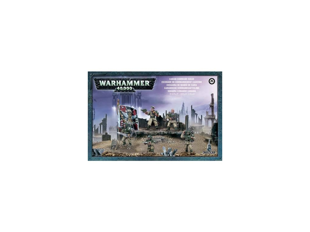 This box set contains five multi-part plastic Cadian Command Troopers. This 79-piece kit contains enough components to enable you to assemble five specialist troopers, including: an Officer, a Medic, a Special Weapon Trooper, a Vox-caster and a Guardsman with Company Banner. The squad can be armed with a choice of weapons including: a sniper rifle, a heavy flamer, a plasma gun, a grenade launcher, a flamer, a melta gun, a powerfist, a chainsword, a power sword, a plasma pistol, a bolt pistol and a laspistol. Also included are two different Company Banners, nine different guardsman heads and additional pieces to allow you to customise the rest of your Imperial Guard squads. Models supplied with 25mm round bases.