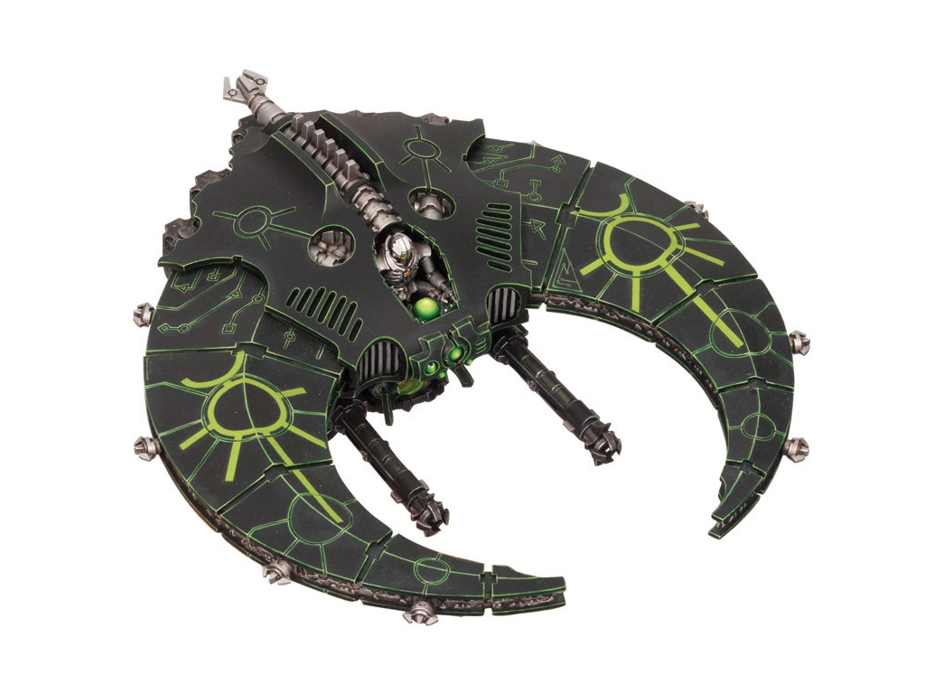 Doom Scythes are heralds of terror and dismay, supersonic fighter craft that range far ahead of a Necron invasion. Doom Scythes can function in a highly independent manner. Much of the craft's superstructure houses datastacks that are in turn heavily laden with strike plans, stratagems and tactical variants. When faced with a situation outside of known parameters, the pilot can sift through and retrieve the correct response from this datastack. Thanks to the ruthless precision of his android brain, the pilot can simulate billions of possible strategies in the span of a few nanoseconds.