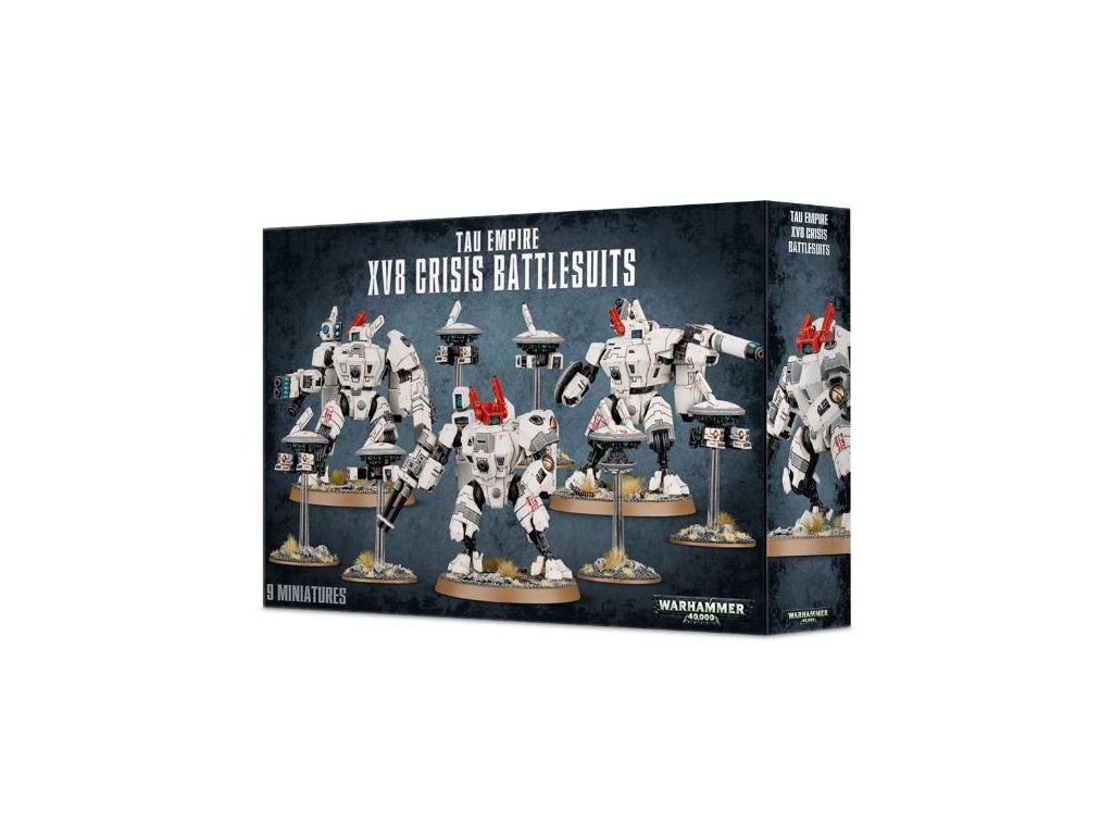 This multi-part plastic kit contains 93 components and a Tau transfer sheet with which to make 3 XV8 Crisis Battlesuits and 6 Gun Drones.