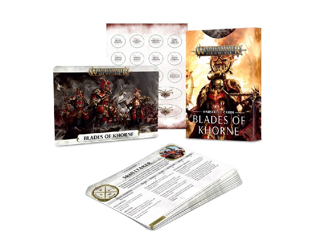This set contains 37 warscroll cards, plus 2 double-sided push-out token sheets. Please note – you'll need a copy of Battletome: Blades of Khorne to use this product!