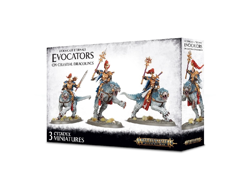 This multi-part plastic kit contains the components necessary to assemble 3 Evocators on Celestial Dracolines. They are clad in Stormcast Eternals armour, with cloaks, tabards and ornate helms denoting their status as lightning-empowered shock troops of Sigmar. Dotted around their forms is the symbol of the Sacrosanct Chamber, the 3-marked anvil. Each wields a tempest blade and stormstave, with the option for 2 to carry a grandstave instead. The Dracolines they ride are large and fearsome, their forms incredibly dense and muscular; each of their 4 feline limbs ends in terrible claws, and their heads are squat and heavy. The Dracolines have little needs for armour, merely accessorised with a set of reins and saddle each.
