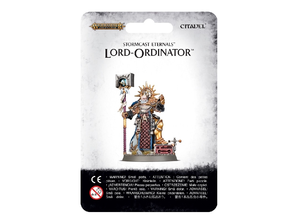 This multi-part plastic kit contains the components necessary to build a Lord-Ordinator. He comes clad in impressively ornate sigmarite armour – slightly less than most Stormcast Eternals, as his arms are bare between the gauntlets and his lion-and-hammer-motif shoulder pads. He wears a large textured tabard over his chest plate, which extends to a cloak at the rear, held fast by a belt featuring engineering and siege equipment – guides, measuring devices and a ratchet/wrench mechanism hang from his hips. He is using an open box of tools as a footrest – this box features an anemometer. He wears no helmet – instead, we’re treated to a view of his glorious facial hair. Behind his head is an arcanabulum, and topping off the symbolism nicely is an anvil and pair of callipers on his belt. Weaponry-wise, he holds a huge astral grandhammer in his right hand, with his left hand holding the astrolabe which he is peering at with a stern, quizzical glare..