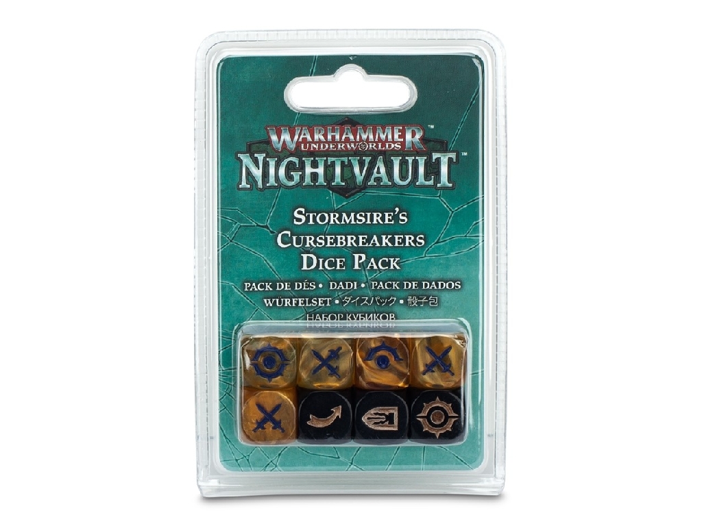 This is a set of Stormcast-themed dice for use with Warhammer Underworlds: Nightvault. It contains 8 six-sided dice - 5 gold and blue Attack dice and 3 black Defence dice, with the appropriate symbols on each. Pick up a set for spares - you can never have too many!