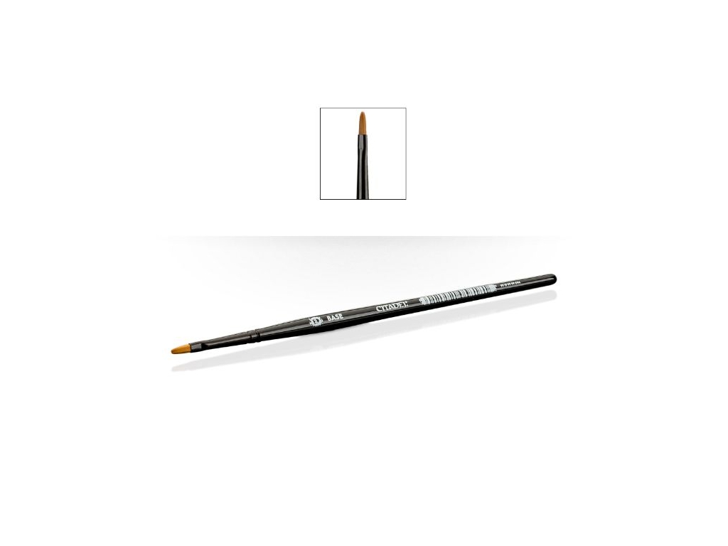 This medium brush (M Base), ideal for basecoating features a flat shape with a curved top, entirely synthetic bristles for extended durability and two differing styles - side on for coverage, and a flat edge for detail.