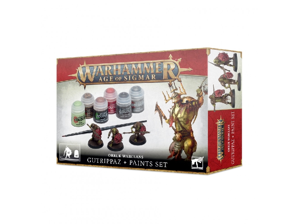 3 db könnyen összerakható Orruks Warclans Gutrippaz figurát, 6 db festéket és egy ecsetet tartalmazó doboz.