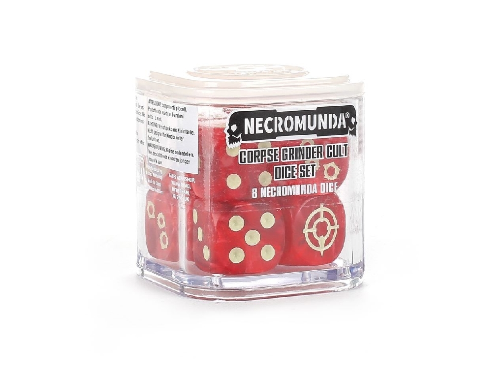 Show your dedication to the Lord of Skin and Sinew with this special Corpse Grinder Cult-themed dice set. The eight 16mm dice are red with a marbled effect and feature a bone coloured in-fill on the numbers and symbols.