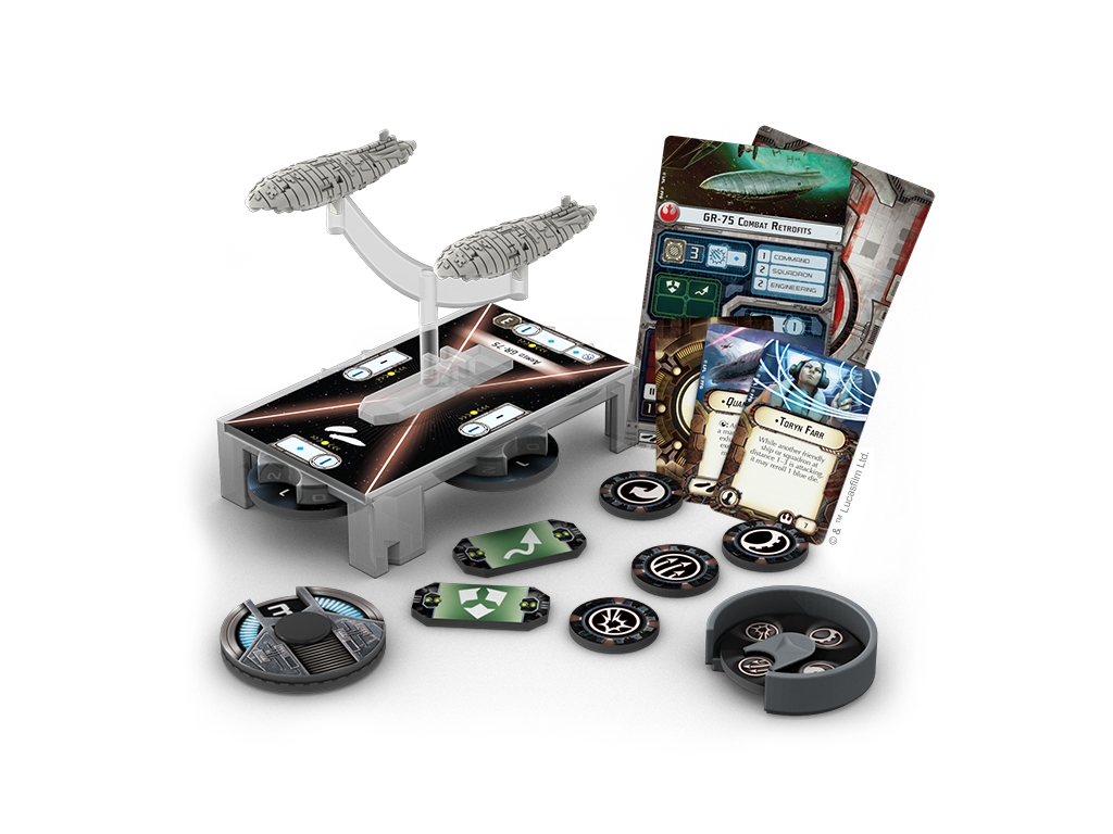 The Rebel Transports Expansion Pack contains two GR-75 medium transport miniatures, two ship cards, eight upgrades, one rules reference card, and all necessary components.