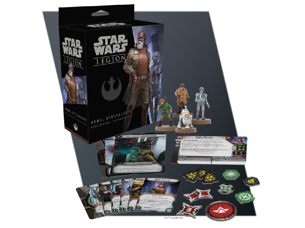This expansion for Star Wars: Legion contains four finely sculpted Rebel specialist miniatures, along with new unit, upgrade and command cards. This expansion allows a player to field a generic Rebel commander unit and to add a comms specialist, medical droid, and astromech droid to other units in their army.