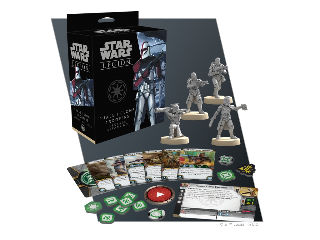 The Phase I Clone Troopers Upgrade Expansion contains four unpainted, finely sculpted soft plastic Phase I Clone Trooper miniatures to enhance your existing Phase I Clone Trooper units or to form one corps unit, along with new personnel and heavy weapon upgrade options.