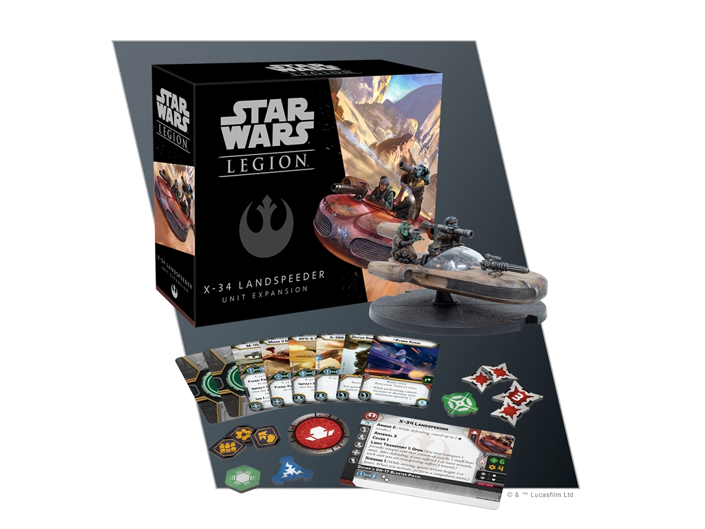 Already a speedy craft thanks to its powerful repulsor engine, an X-34 Landspeeder becomes a threat to even the toughest Imperial opponents when driven by an experienced pilot and equipped with an assortment of weapons. The X-34 Landspeeder Unit Expansion adds one X-34 landspeeder miniature—complete with two unique weapon options—to your Rebel armies. Along with the beautifully sculpted, finely detailed miniature, you’ll also find a unit card and all the tokens you need to get your X-34 up and running in this expansion, as well as a range of upgrade cards to customise it to your specific battle plans.