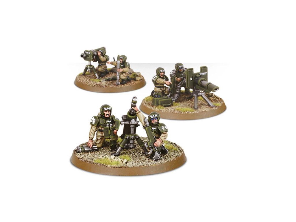 Heavy Weapon Teams Are Either Part Of Normal Imperial Guard Squads Or They Can Be Grouped Together To Create Support Squads That Provide Cover For The Advancing Troops. This Set Enables You To Build Up To 3 Imperial Guard Heavy Weapon Teams. Each Team Of Two Cadians Can Be Equipped With Any One Of The Following Weapons: Lascannon, Heavy Bolter, Missile Launcher, Auto Cannon Or Mortar. It Is Possible To Give All Teams The Same Heavy Weapon To Build A Support Squad.