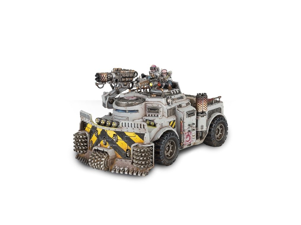 Built to withstand the pressures and challenges of underground mining, the Goliath Rockgrinder is a devastating piece of equipment when turned to aggression. Surging forward into the massed ranks of the enemy, servo-mounted weaponry seeking and destroying priority targets, the Rockgrinder drives ever-forward, its sawtoothed drilldozer ripping apart anything foolish enough to stand in its path. The fourth-generation cultist standing atop the vehicle efficiently uses its industrial equipment as a weapon of war – heavy mining lasers, seismic cannons and clearance incinerators, though designed for mining and gathering resources, are perfectly suited to annihilation.