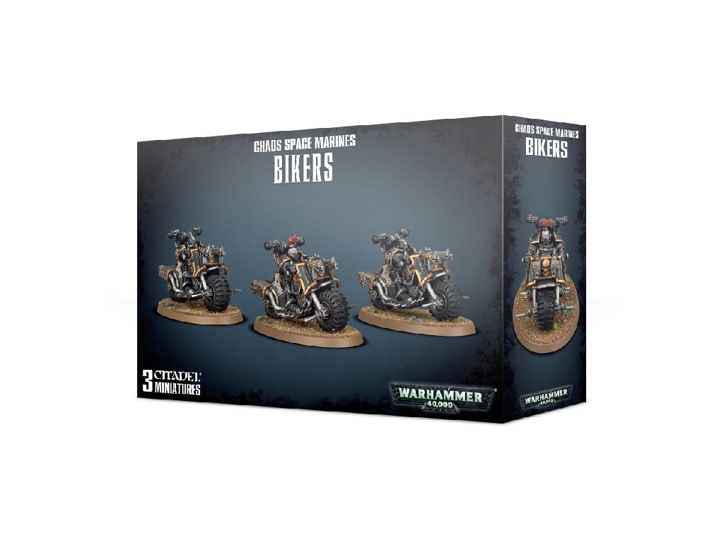 This box is the most cost effective way to buy three multi-part plastic Chaos Space Marine Bikes. The bikes can be armed with twin-linked bolters, whilst there are bolt pistols for the Bikers, and a Chaos Space Marine Transfer Sheet.