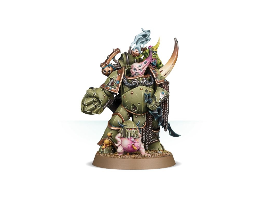 This multi-part plastic kit contains the components necessary to assemble a Plague Marine Champion, who can be added to a unit of Plague Marines. Clad in bulging, rusted power armour, he comes with a choice of two variant heads – one helmeted, and one bare (with an unsettlingly large horn growing out of his face…). Befitting his Champion status, he is decked out in chainmail, with a cloak prominently featuring the symbol of Nurgle. He is armed with a plaguesword and power fist, and includes a boltgun which hangs from his backpack. 2 Nurglings are included – one atop his shoulder, clutching a smoking censer, and one optional Nurgling for his base, comically clad in a Death Guard helmet.