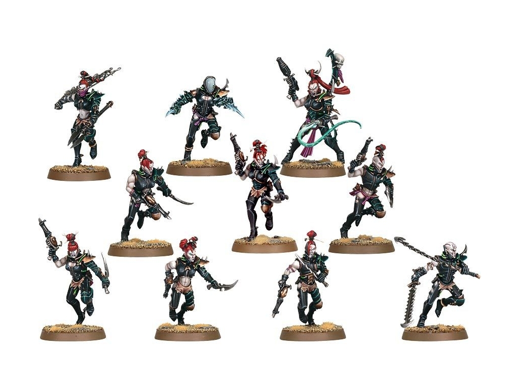 This box set contains 10 multi-part plastic Drukhari Wyches. This 92-piece set includes: 14 different heads, 10 different bodies (six female variants and four male variants). Also included are all of the weapon options listed in Codex: Dark Eldar, including: a razorflail, a blast pistol, a shardnet, a power weapon and an impaler. Models supplied with 25mm round bases.