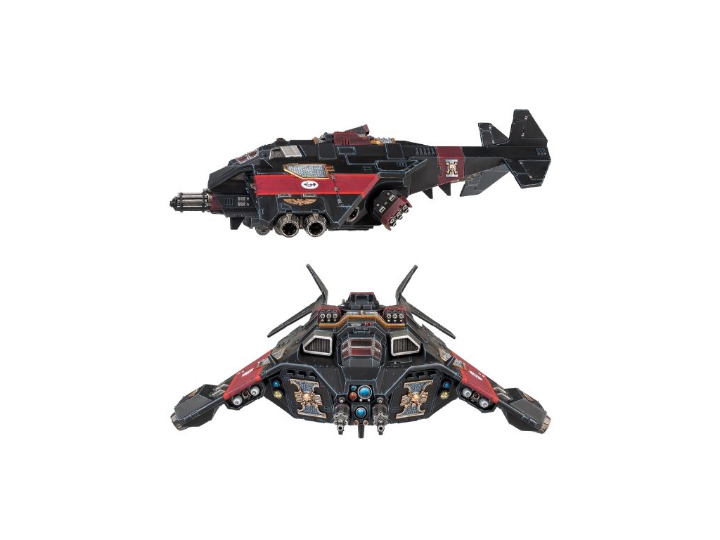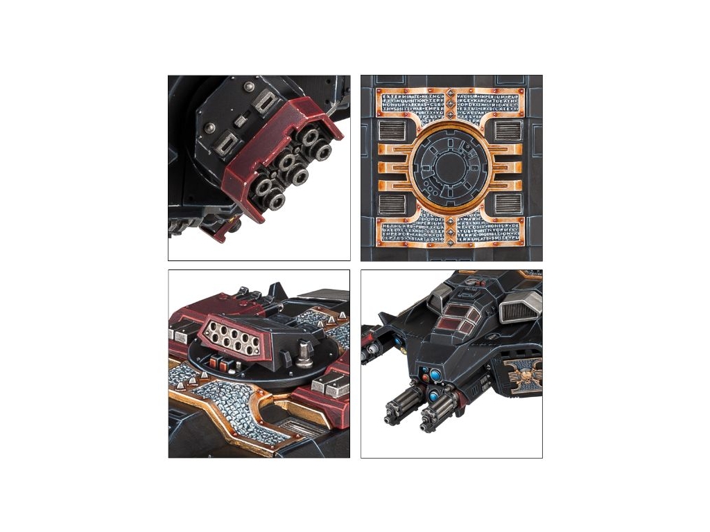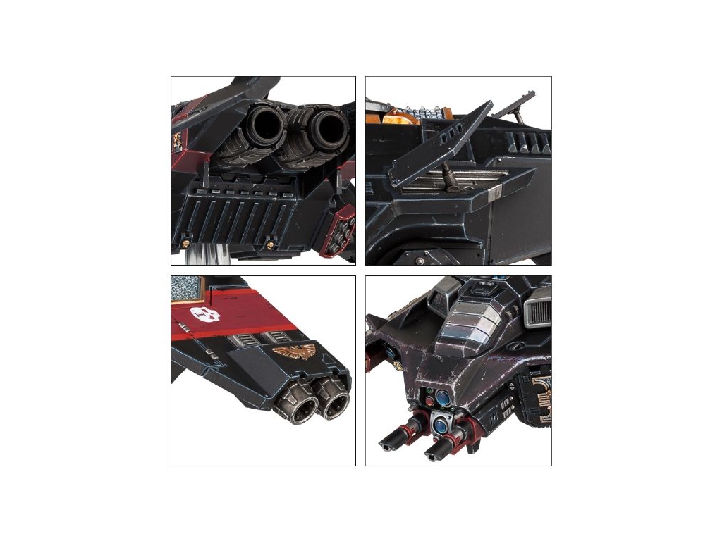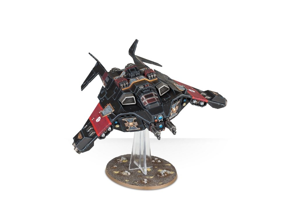 Far, far more advanced than the other Imperial craft which it resembles, the Corvus Blackstar is truly worthy of ferrying a Deathwatch Kill Team to their brutal mission. Optimised for alien hunting, surprisingly agile, its heavy weapons scream death from the skies as it descends toward its mission-critical targets. Halo-launchers fan out and blur the Corvus Blackstar’s outline as the twin hatches slam open, pouring out its cargo of specialist Deathwatch from within to charge directly into the fray.