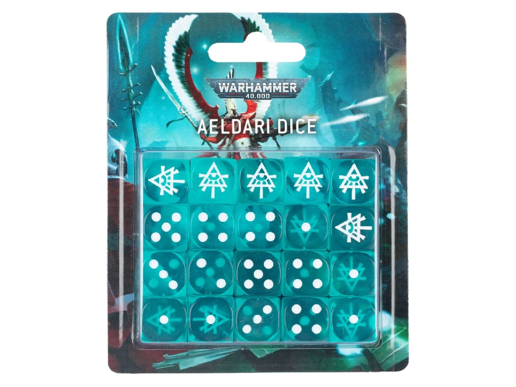 Each six-sided, round-cornered dice is a translucent turquoise colour. The 20 dice in this set each measure 16mm x 16mm and feature an Aeldari icon on the 6 face and traditional pips on the other faces, all coloured white. The dice are supplied in a blister pack with a backing card featuring Aeldari artwork.