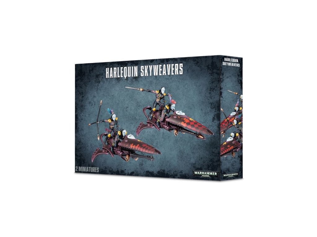 This box contains everything you need to make 2 Harlequin Skyweavers, each with a pilot and pillion rider. Each Skyweaver is armed with a shuriken cannon and mirage launcher, the shuriken cannon can be replaced with a haywire cannon. The pillion riders can each be armed with either star bolas or a zephyrglaive, and there are five heads with space to add one of 7 individually designed masks for both the pilots and pillion riders, as well as one completely masked head.