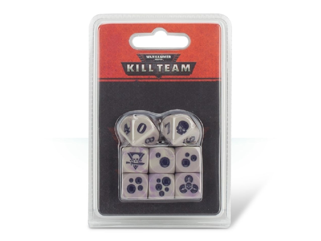 This set contains 6 6-sided dice and 2 10-sided dice – the former used during games of Kill Team, the latter used to roll on certain tables when assembling your squad ready for combat. Themed to represent the Gellerpox Infected, these dice are swirled purple and off-white, with purple markings. The D6 feature an icon of Nurgle in place of the 6 and a Kill Team logo in place of the 1; the D10 feature a skull in place of the 1.