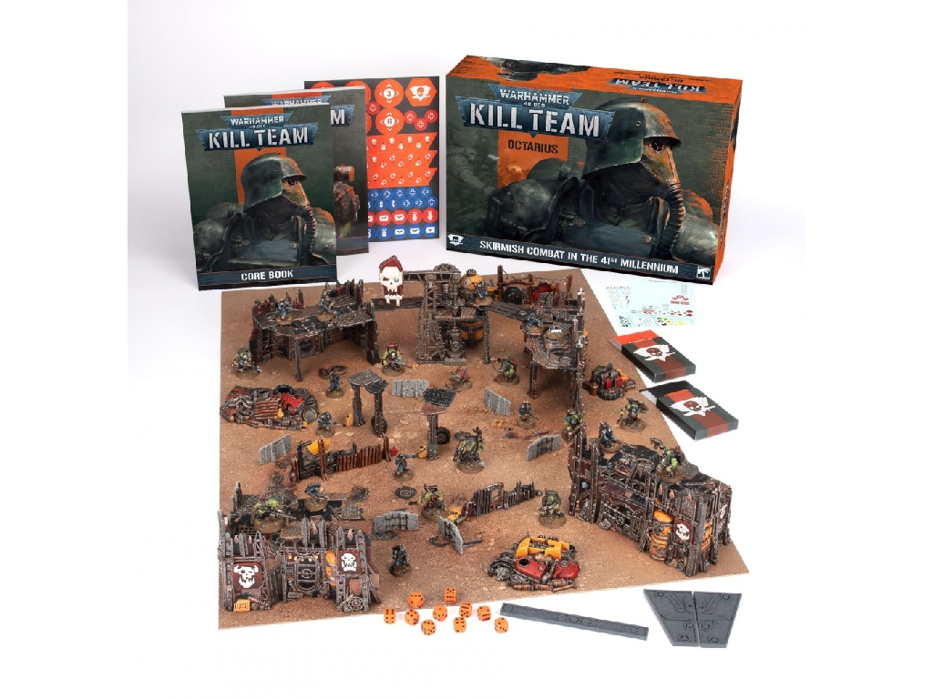 A rogue Inquisitor’s gambit has failed. Hordes of Orks and Tyranids, set against each other in hope of mutual destruction, only grew stronger and now threaten to spill out of the Octarius sector into surrounding space. Only the desperate actions of highly specialised kill teams keeps their rampage in check, but they are not the only ones skulking through the shadows. Elite operatives clash in close confines, engaging in furious firefights and deadly duels, and the fate of billions hangs in the balance. The new edition of Warhammer 40,000: Kill Team has been redesigned from the ground up as the greatest tabletop skirmish experience yet, and Kill Team: Octarius is the perfect place to start your campaign of clandestine missions. This incredible boxed set includes two full kill teams – Veteran Guardsmen of the Death Korps of Krieg and cunning Ork Kommandos – alongside all the rules, terrain, and accessories you need to start playing. This boxed set includes: 1x 144-page Kill Team Core Book: Learn your way around the brand new Kill Team with this tome of clear, concise rules for matched play, open play, and narrative play missions. Alongside the rules, you'll find pages packed with lore introducing the dark and gritty world of Kill Team and insight into both the Collecting and Gaming sides of the hobby. 1x 96-page Kill Team Octarius War Manual Book: Discover the background behind the kill teams included in the box, including rules for fielding them in games of Kill Team and a host of missions set within the rapidly destabilising Octarius sector. 23x Citadel Miniatures: Two full kill teams of Veteran Guardsmen and Ork Kommandos form the heart of Kill Team: Octarius, each featuring a wide array of customisation and alternate assembly options. Extra detail parts allow for deep personalisation of your kill team, with many models able to be assembled as multiple different kinds of operative. Each team also comes with a full transfer sheet with over 400 markings and emblems for customising your models. 17x Terrain Pieces: Create a ramshackle Ork shanty town with brand new ruins, platforms, and scattered refuse. The terrain represents the sorts of environments commonly found throughout the Octarius sector, and presents new challenges for even the most experienced Kill Team commanders. 3x Combat Gauges: The new edition of Kill Team uses a simplified measurement system to create fast, dynamic games. These combat gauges feature the new system’s symbols and are perfect for slotting into narrow gaps between operatives when a regular tape measure would be too cumbersome. Additional Accessories: Get straight into the game with a double-sided game mat, two decks of 27 Tactical Ops cards, and 10 dice.