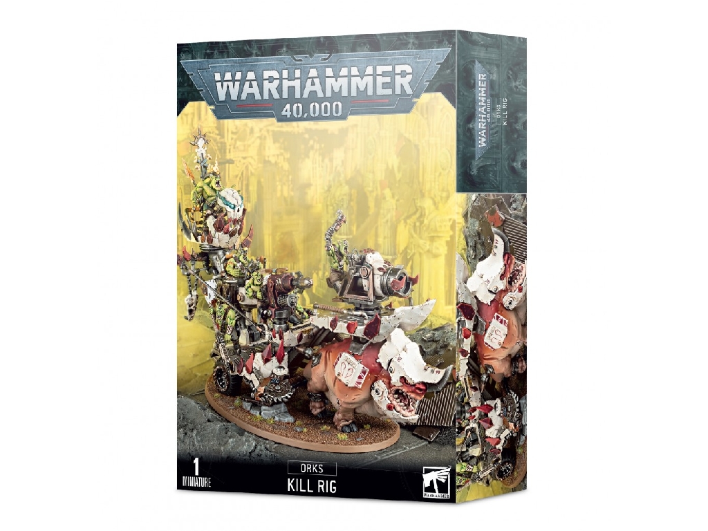 Few sounds are as terrifying as the cacophony of hollering, clattering, and stomping that heralds the arrival of an Ork Kill Rig. Packed with savage Orks and pulled by a colossal tramplasquig, these ramshackle constructions are mobile death platforms, outfitted with all manner of weapons. From atop the wurrtower at the back of the rig, a Wurrboy can survey the battlefield, firing out powerful bolts of psychic energy at Ork and enemy alike. Alongside this psychic amplifier, the Kill Rig also carries a crew, including a driver, gunners, and Butcha Boyz, and is outfitted with a 'eavy lobba and stikka kannon for maximum destruction.