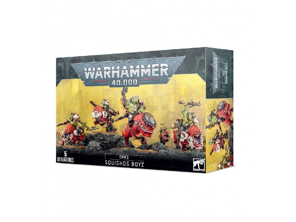 The Squighog Boyz are armed with rokkit-propelled stikkas, and many of their limbs – and those of their mounts – have been replaced with bionic enhancements.