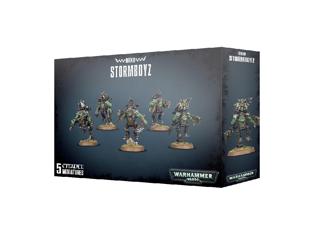 Stormboyz, the shock troops of many successful warbands, dedicate their lives to the time honoured martial disciplines of drilling, marching and hurtling through the air. To this end they go to war strapped to rokkit packs that, when activated propel their wearers forward on great tongues of oily black flame.