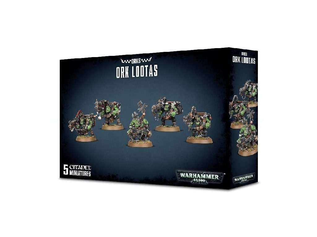 This multipart plastic boxed set contains enough components to make 5 models: either 4 Burna Boyz or 4 Lootas, as well as an Ork Mek armed with a kustom mega-blasta.