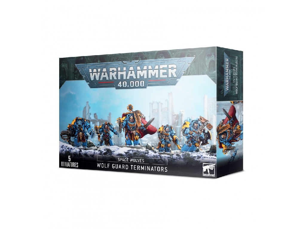 This box set contains five multi-part plastic Space Wolves Wolf Guard Terminators. This 100-piece set includes: five different leg variations, five torso variants and 13 different shoulder guard variants, and 13 heads. Also included are: four sets of wolf claws, an assault cannon, four thunder hammers and storm shields, a heavy flamer, five storm bolters, three power fists, two chainfists, a frost axe, and a power sword. Models supplied with 40mm round bases.