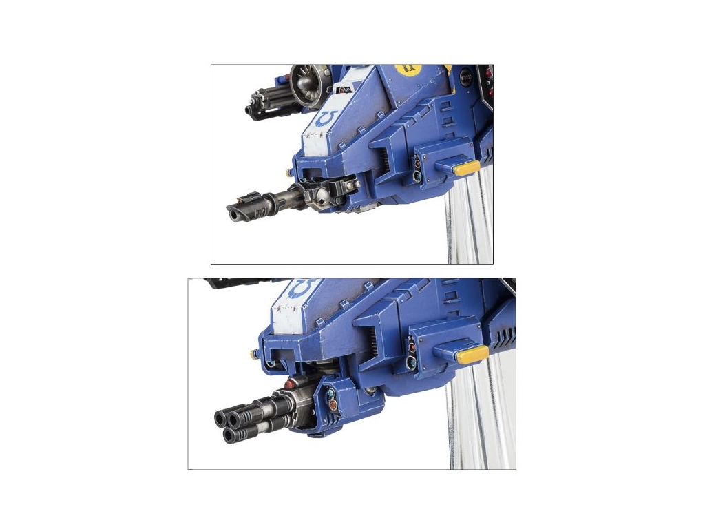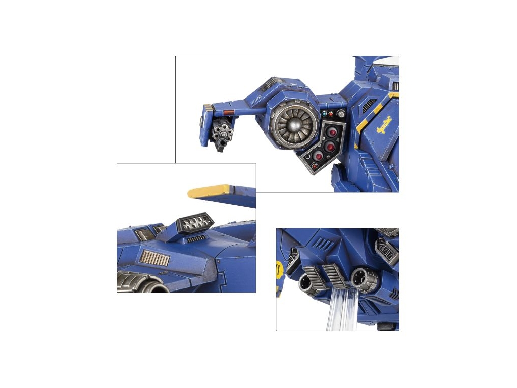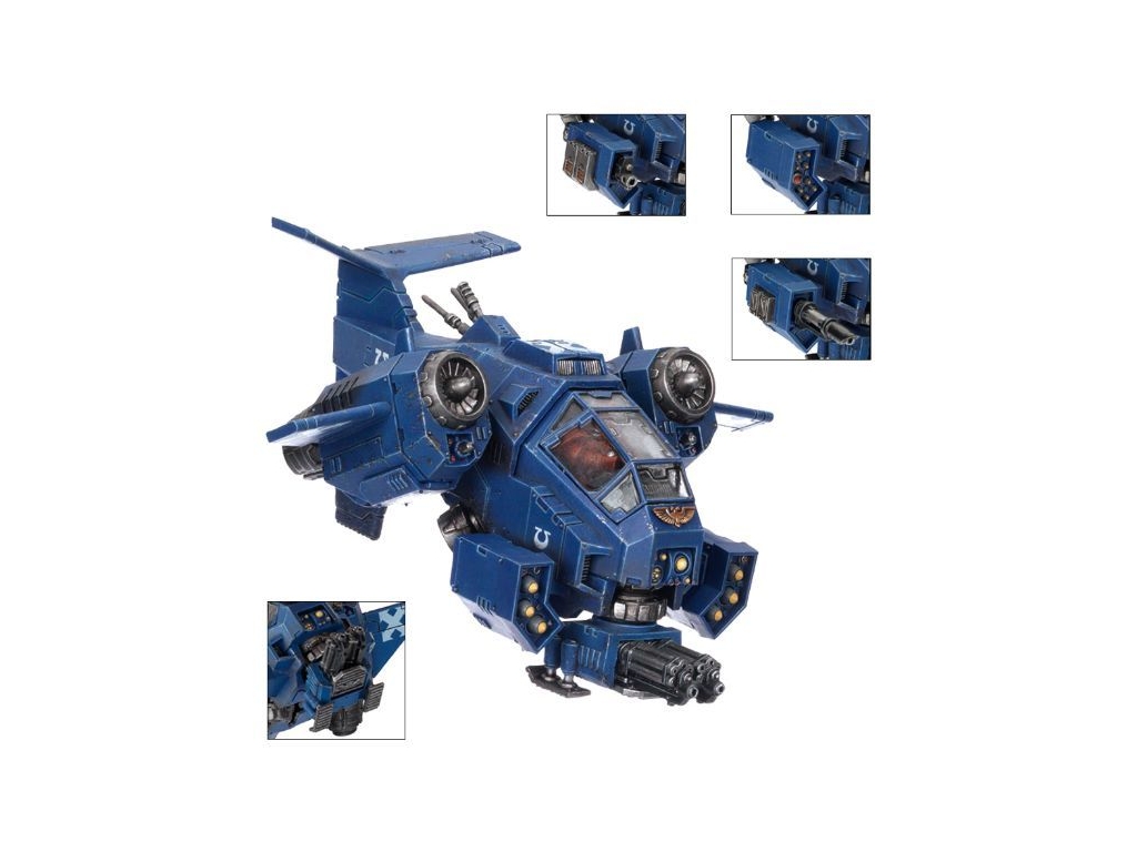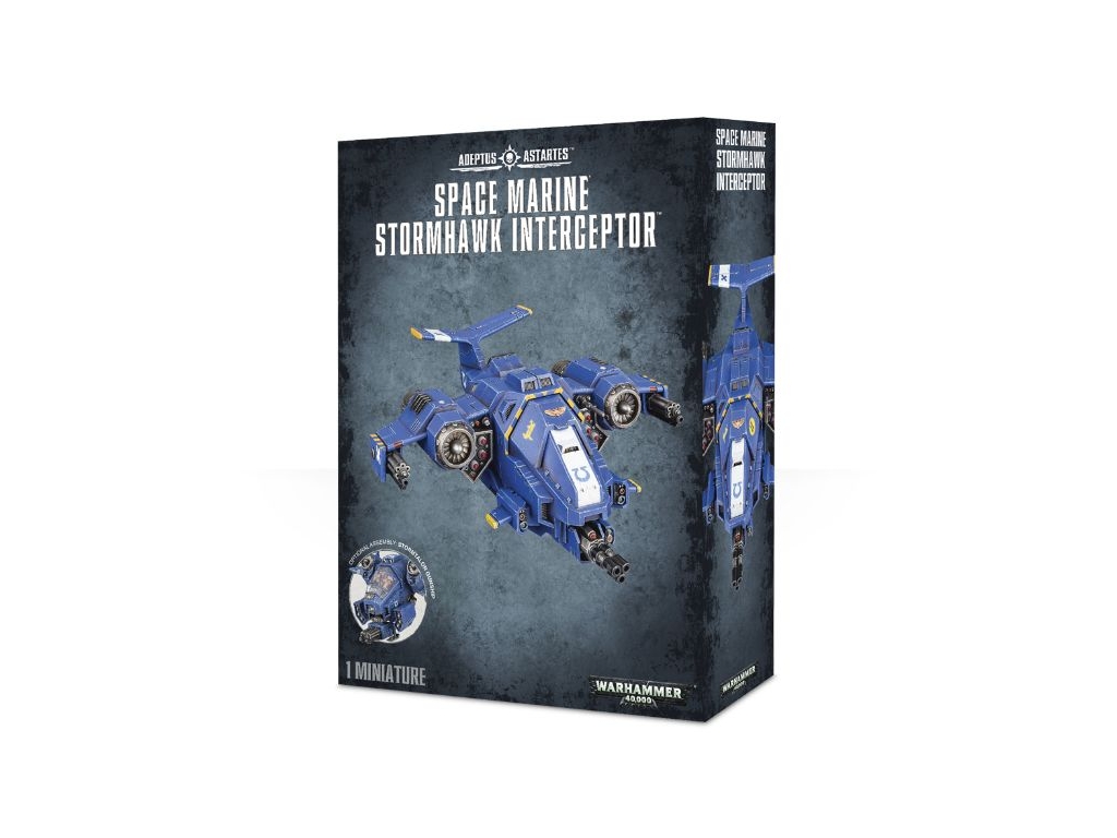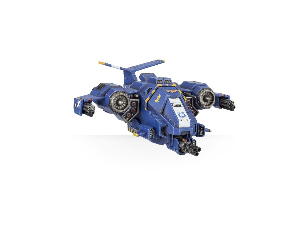 An awesome sight, descending at incredible velocities from orbiting warships to engage and annihilate enemy craft, Stormhawk Interceptors are a stunning hymn to aerial superiority that the Space Marines sing with gusto. The frontal armour and huge firepower makes them excellent dogfighters, hurtling through the clouds to execute target after target in a blazing display of incendiary defiance. Often seen in Vehemence Attack Patterns, Stormhawk squadrons and their golden haloes of flares discharged to gently dissuade incoming fire are a signal that whatever planet the skies are over, they belong to the Emperor.