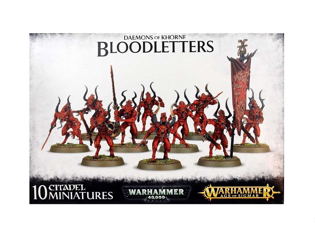 Bloodletters are known as the footsoldiers of Khorne, the Warriors of Blood or the Horned Ones. Like the God from which they are born, Bloodletters have only one desire and that is to shed blood on the field of battle. This boxed set contains 10 multi-part Bloodletters of Khorne and includes options for a Champion, Standard Bearer and Musician.