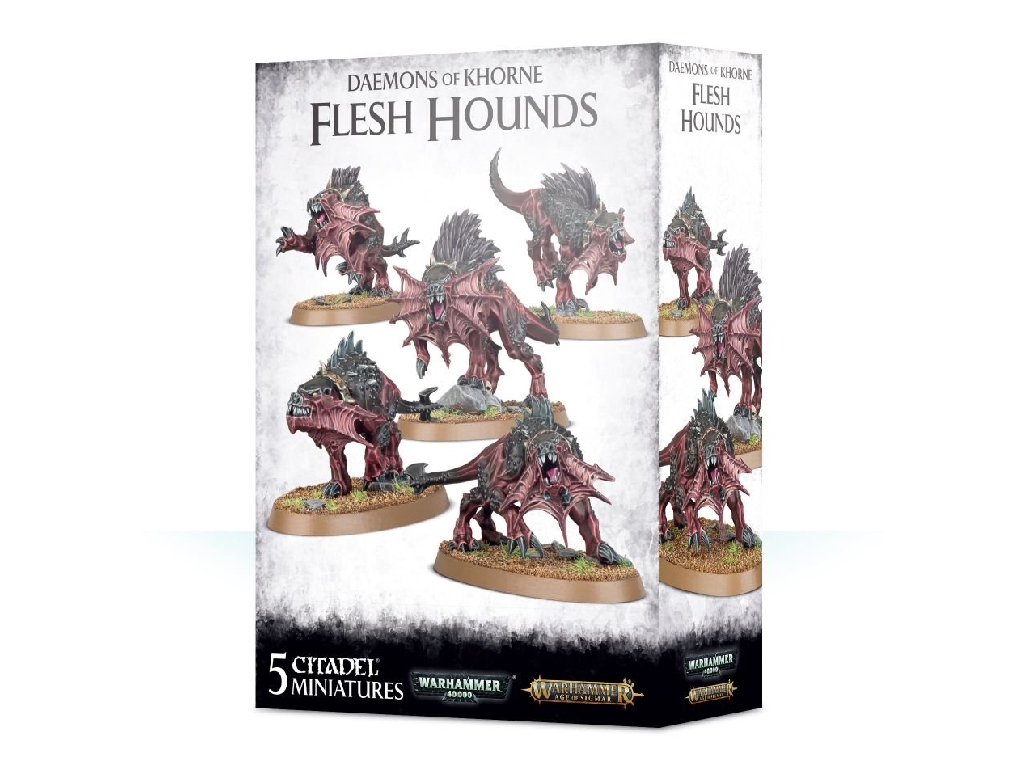 This kit contains everything you need to build five Flesh Hounds. Each is armed with blood-dark claws and wears a collar of Khorne.
