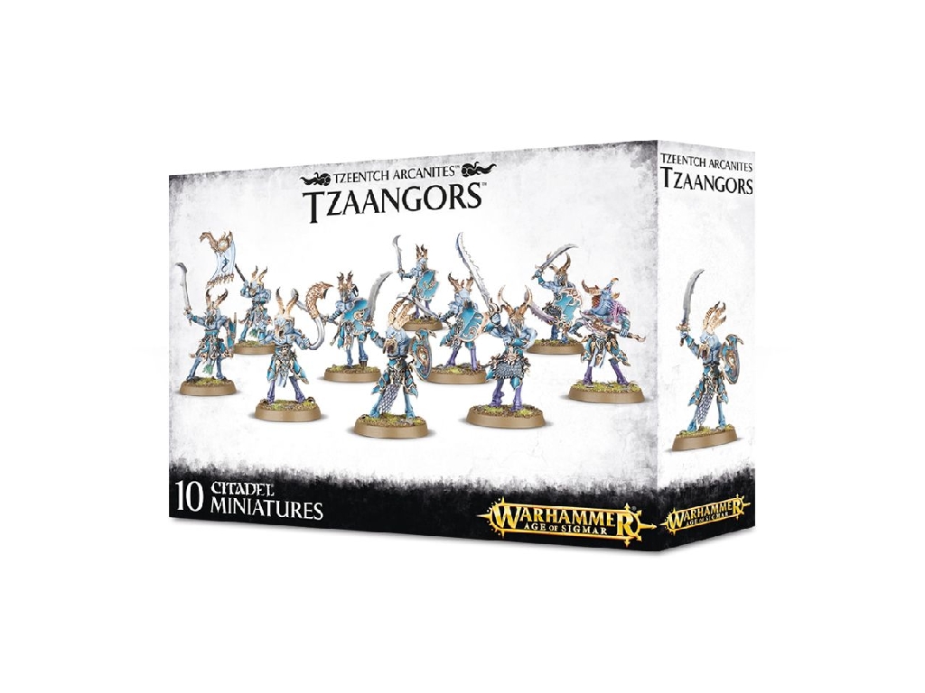 This multi-part plastic kit contains the components necessary to assemble 10 Tzaangors, bedecked head to foot in the avian symbolism of Tzeentch. These models have a huge amount of customisation available: