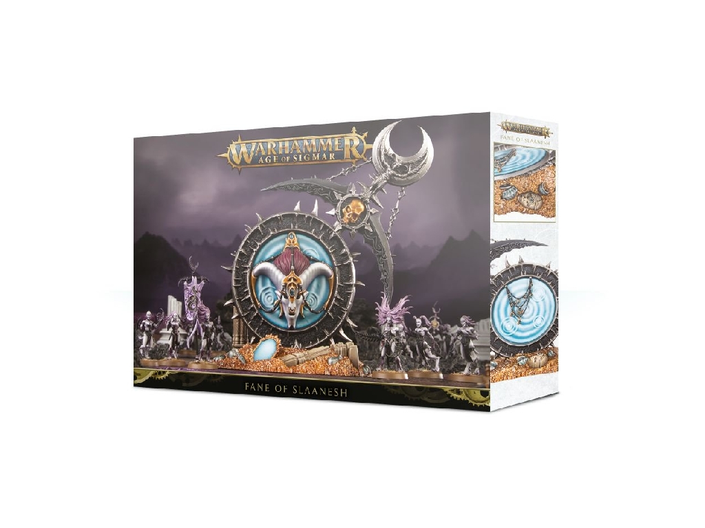 A Fane of Slaanesh is a focus of worship wrought in precious metal. Around it are laid offerings to the Dark Prince, but in truth it is one of his most exalted greater daemons that peers through. Those whose offerings meet with the creature’s approval are rewarded highly – but those who offend are justly punished.
