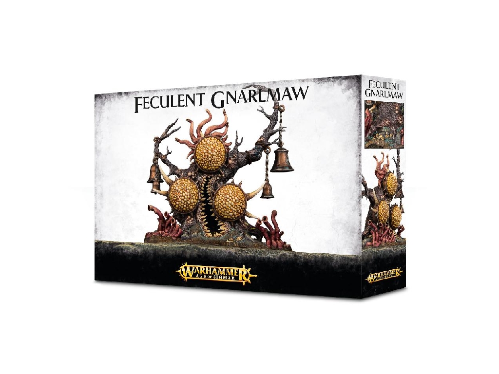 This multi-part plastic kit contains the components necessary to assemble a Feculent Gnarlmaw. Dominated by 3 large bulbs describing a Nurgle icon, covered in chitinous bumps and boils (this is not a model for the tryptophobic!), the Gnarlmaw looks almost like some struggling creature rather than the twisted tree it allegedly is. An enormous mouth runs up the centre of the trunk, with dozens of razor-sharp teeth lining it, while the few stunted branches that grow from it feature dismal bells, tentacles and more pustulent boils. A Nurgling is depicted emerging from the rear, and the base of the model is detailed with the skulls of those who have been foolish enough to venture near…