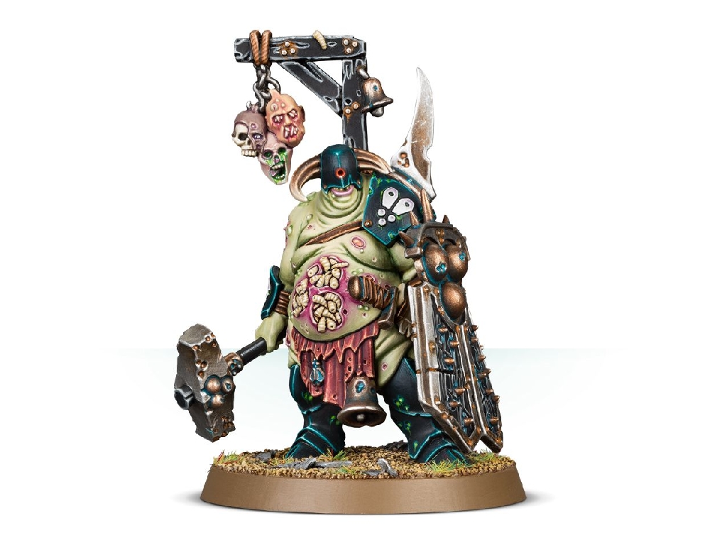 A Lord of Blights is a brutish figure who creates and destroys in equal measure. Swollen with muscle, he lumbers into the midst of the foe swinging his bubotic hammer in thunderous arcs. Every impact shatters bone and ruptures organs, leaving his victims lying like bruised and rotten fruit on the ground. Yet this brutality has a purpose beyond simple murder – the Lord of Blights cultivates fine crops of death’s heads that he hands out to his warriors, enabling them to fling volleys of diseased projectiles. The Lord of Blights keeps the finest specimens for himself, hanging them from his gallowrack to hurl during battle.