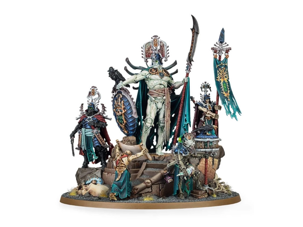 Katakros stands in the centre of a sculpted base surrounded by his most trusted retainers – the Prime Necrophoros, the Liege-Immortis, the Gnosis Scrollbearer and the Aviarch Spymaster. Armed with Inda-Khaat and the Shield Immortis, he towers above them all. He forms the perfect centrepiece of any Ossiarch Bonereapers army.