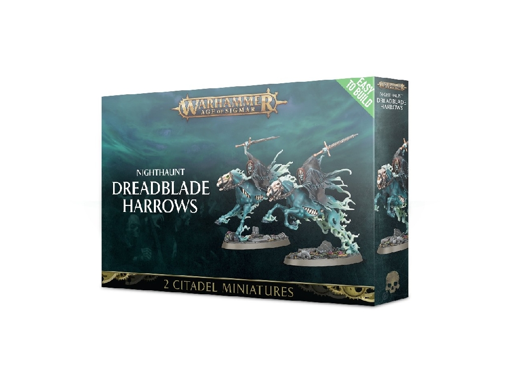 The Dreadblade Harrows are a pair of mounted spectral knights, seemingly a touch more solid than many of their Nighthaunt brethren, but no less sinister. Each is armed with a dreadblade held aloft in their right hand, with their left hands clutching the reins – one set spiked, one set ornate – of their steed. Not much else is visible of the Harrows themselves, with a helmeted skull peering out from beneath their cloak. Their mount is large and muscular; its ethereal skin is torn and tattered, making its ribcage visible, with its head being no more than a skull. The rear of the steed is depicted as tailing off into ethereal vapour, as the Harrow emerges from nothing to attack.