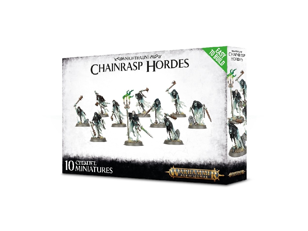 The most numerous of all the spirits that join Nighthaunt processions are the Chainrasp Hordes. These gheists are created from the spirits of the most vicious and irredeemable criminals to have lived in the Mortal Realms. They are lesser spirits, held together in the afterlife by nothing other than their own never-ending spite and all-consuming madness, a negative energy which saps the will of their enemies. Chainrasps may have thought death to be an escape from terrible imprisonment but, in truth, it was merely the beginning.