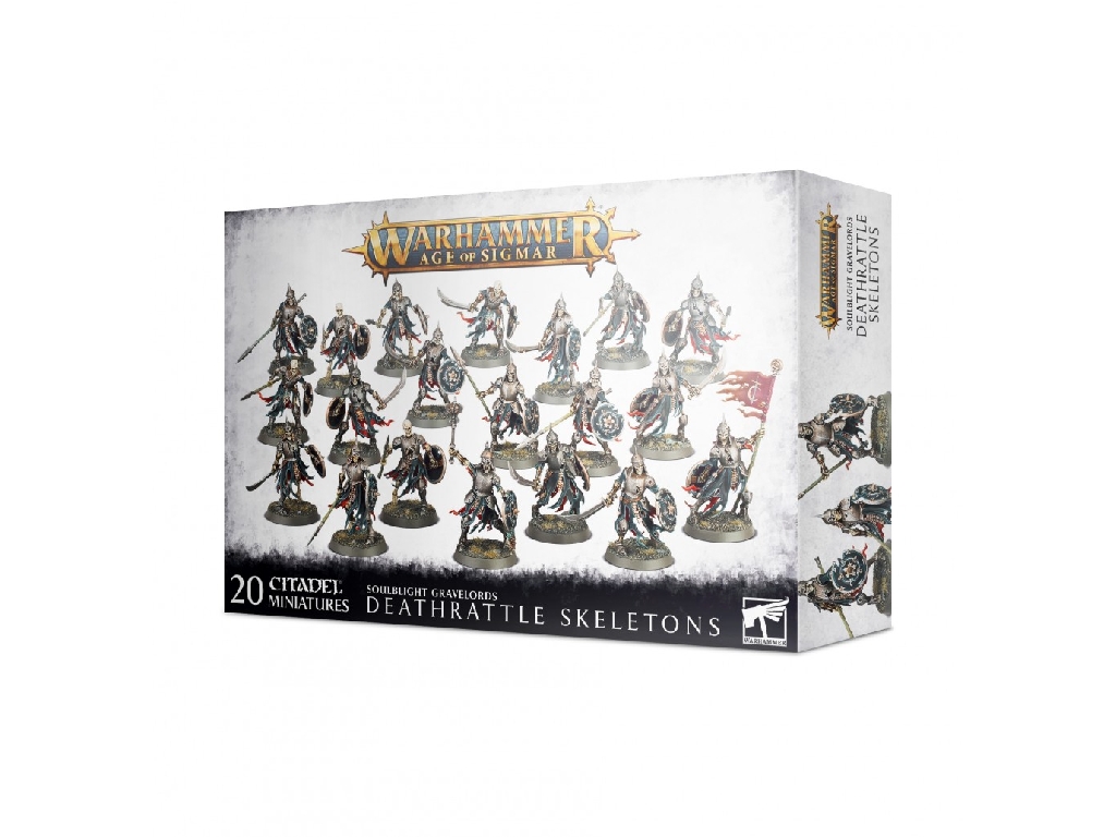 While not the greatest of soldiers individually, Deathrattle Skeletons advance across the battlefield in an unending tide of clanking bones and steel, and make up for their shortcomings with sheer numbers. Even those who think they've struck down their grinning, soulless opponents find that the death-magics of Shyish cannot be denied, and the skeletons rise again for another go.