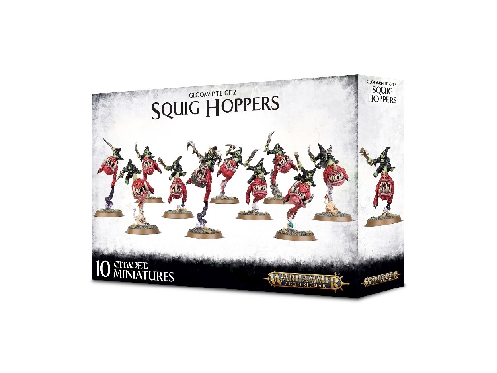 Squig Hoppers bound madly into battle, wreaking havoc on anything they collide with. Each hurtling squig has a cackling grot clinging to its back, flailing wildly at nearby enemies as he tries vainly to steer his weird steed.