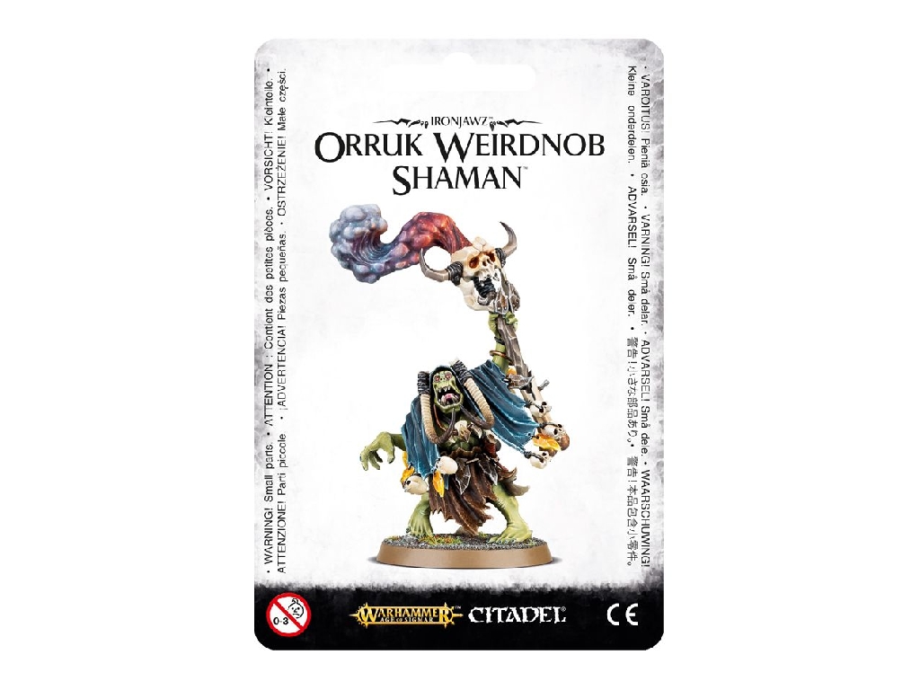This multi-part plastic kit contains the components necessary to assemble one Weirdnob Shaman, the bizarre and unpredictable wizard of the Ironjawz. Posed in a twitching, staggering stance as the power of the Waaagh! flows through him, he’s covered in detailed shamanic fetishes and is armed with a smouldering Waaagh! staff. 13 components, supplied with a Citadel 40mm Round base.