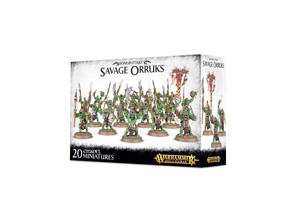 This multi-part plastic kit contains all the parts necessary to assemble 20 Savage Orruks, armed with either chompas or stikkas and bone shields. Optionally, they can be assembled as Savage Orruk Morboys, with chompas and toof shivs, or Savage Orruk Arrowboys carrying Stinga Bows. There are options for a Boss, Bone Totem and Skull Thumpa, and the kit comes supplied with 20 Citadel 32mm Round bases.