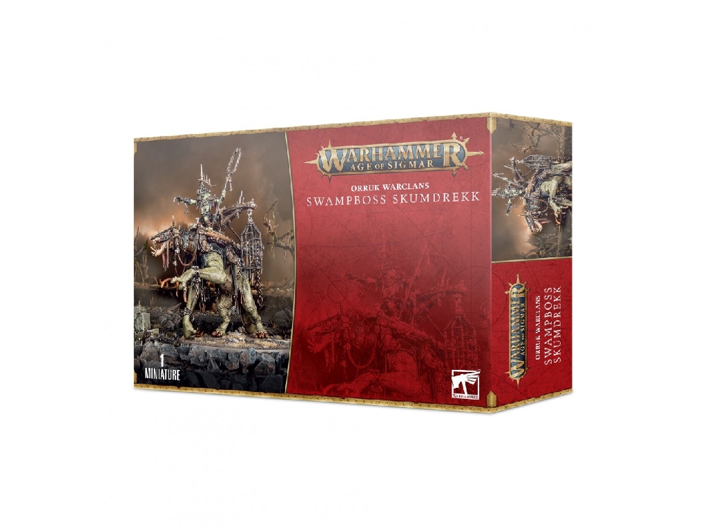 Of all the Snatchabosses, Skumdrekk is the vilest and most kunnin'. As such, he has become a sort of celebrity to the Kruleboyz of Ghur. Owner of the Murkvast Menagerie – a huge, drained mangrove swamp that acts as prison for scores of vicious and unusual beasts – Swampboss Skumdrekk is a living legend. He rides into battle on his most prized conquest, Sloppklaw, the unusually fierce sludgeraker beast he turned to his will as a younger orruk.