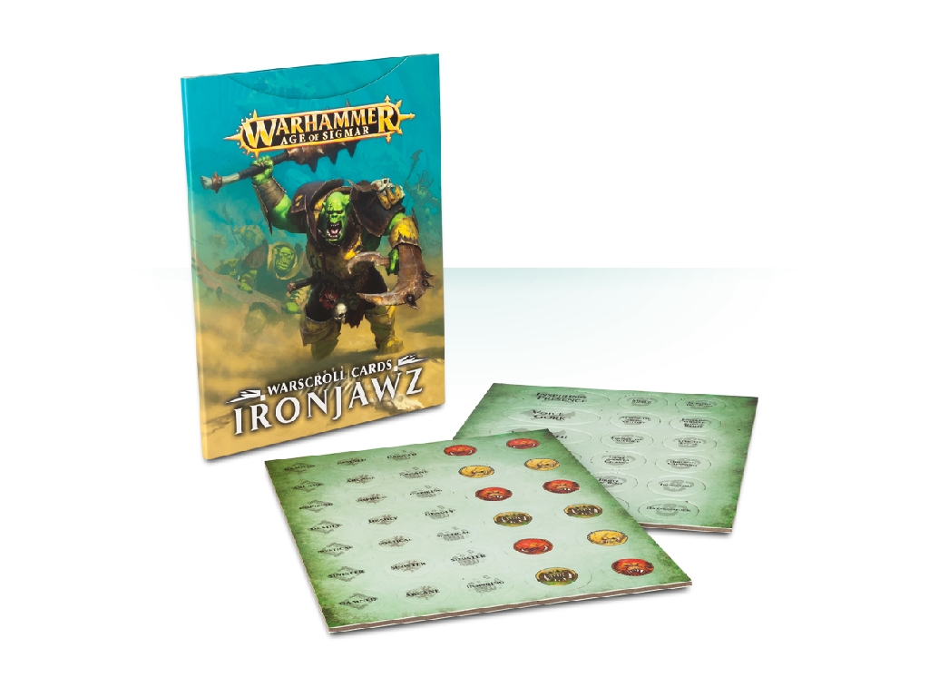 This pack of 8 large-format cards contains each of the unit Warscrolls from Battletome: Ironjawz, printed on individual cards for handy reference in your battles, along with a selection of double-sided card gaming tokens – use these to indicate the Allegiance Abilities, skills and statuses used by your models in games of Warhammer Age of Sigmar.