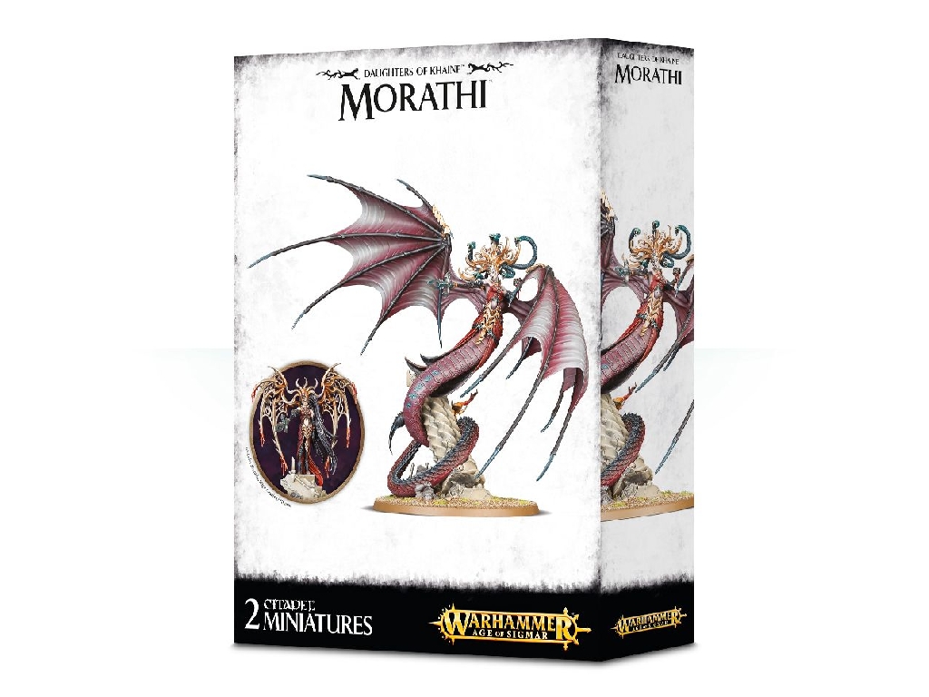 A creature of magic, manipulation and secrets, the High Oracle of Khaine, the Shadow Queen and grand matriarch of the Daughters of Khaine, Morathi is an ancient being, a seeress unmatched in her mastery of dark magics. In addition to being able to summon the horrors of the nightshade-realm, she has used her spells to morph into a comely form – a radiant she-aelf framed by outstretched wings wrought of shadow-metal. So great is her supernatural beauty that foes stand mesmerised by her rapturous allure. This is a fatal mistake, for Morathi wields her spear Heartrender with cruel efficiency, and her bladed pinions are themselves razor-sharp weapons that can easily lop limbs and heads.
