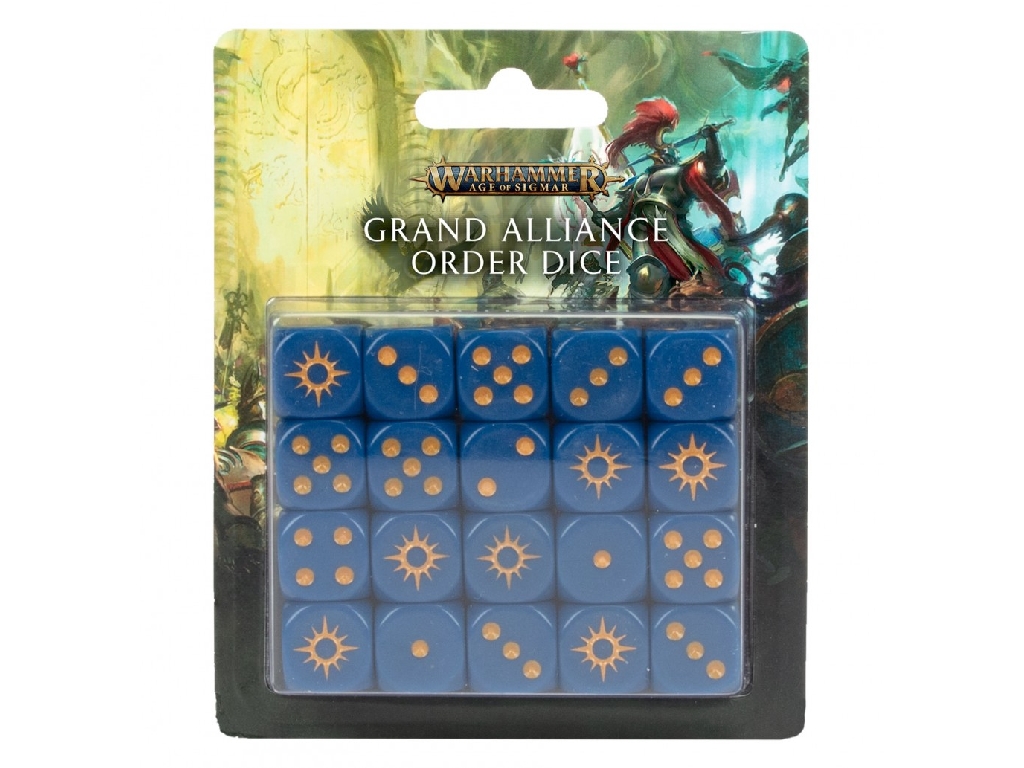 The set contains 20x 16mm, round-edged dice with traditional pips denoting the numbers, but with a Sigmarite halo icon in place of the 6. The dice are all blue – a colour synonymous with the Realm of Heavens – with gold-coloured pips, and come presented in a blistered clampack covered in thematic artwork.