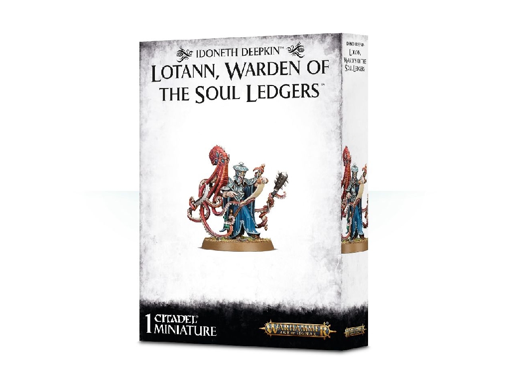 This multi-part plastic kit contains the components necessary to assemble Lotann, Warden of the Soul Ledgers. Hardly concerned with the violence and melee going on all around him, Lotann is utterly absorbed in the Catalogue of Souls – an enormous parchment scroll clutched in his left hand, on which he tallies the Idoneth’s captured souls. He uses a bone quill to do so – on occasion, he’ll use this to stab an encroaching enemy, but for the most part his defense is left to his Ochtar familiar. This is a large, octopus-like creature which looms over Lotann’s right shoulder, brandishing a cudgel, a serrated blade and even thoughtfully carrying a spare scroll, should the tally of souls grow too large to count.